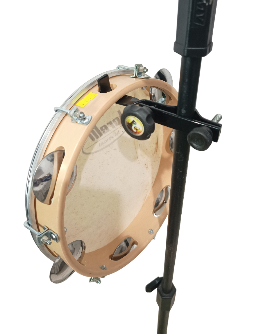 Suporte simples de pandeiro fabricado em metal de alta resistência e pintura epóxi na cor preta, compacto medindo apenas 15x5x5cm, pesando 170g e pode ser transportado facilmente até no bolso, acompanha uma capinha e sendo de simples instalação, desenvolvido por JC suportes para acoplar em pedestal de microfone padrão.